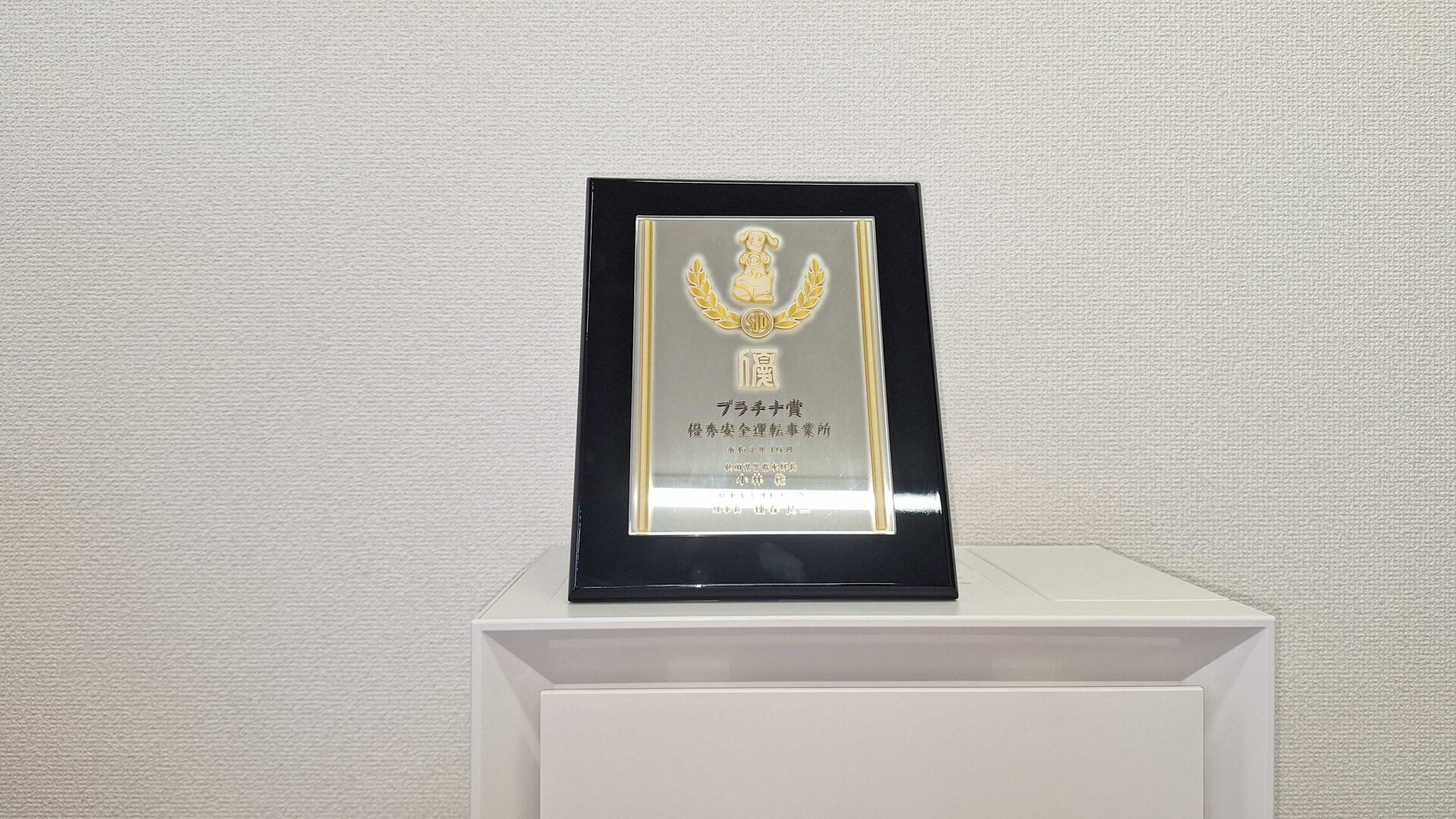 今年は最高賞のプラチナ賞です!!これは社員の皆が日頃から交通事故防止・交通違反防止・安全運転に努めてくれた結果であって大変光栄です。これからも社員一同「安全運転」に取り組んでまいります。